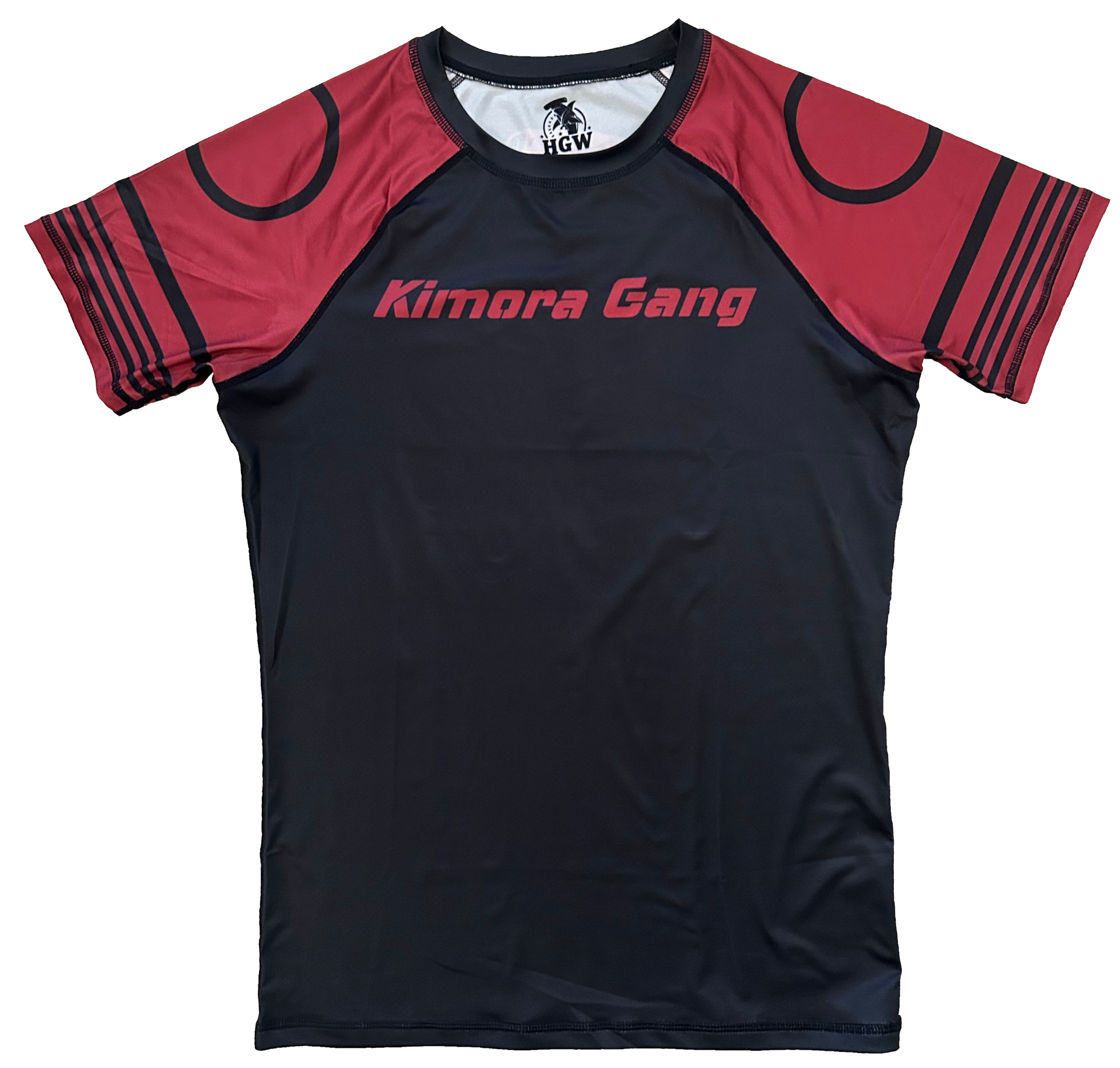 Black and red "Kimora Gang" short sleeve bjj rash guard